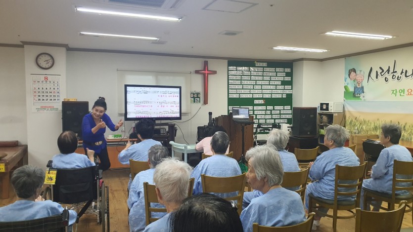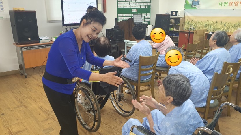 강사님과 눈을 맞추고 열창하는 우리 어르신
